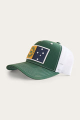 Introducing the Southern Son trucker, this cap is a mid profile design proudly featuring the Ringers Western logo alongside the Southern Cross on an embroidered patch. This cap has a mesh back for optimal ventilation, ensuring all day comfort on hot summer days. The adjustable snapback provides a customisable and comfortable fit. Whether you're out travelling the open road, attending a local festival, or just representing the brand, our trucker caps have you covered.
