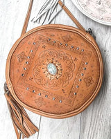 A nod to our best-selling Harlow bag, the Sorrento Round Bag is set with a statement shell inlay, intricate hand tooling and silver hardware. A shoulder strap and full zip compartment makes this the perfect day- to-night bag.