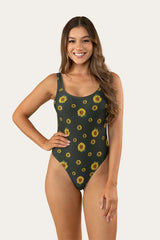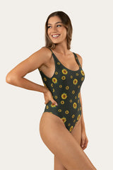 Summer is here and so is Serenity! A new high cut, low back one piece to add to your swimwear collection. Cut from a smooth Sunflower print nylon fabrication, this one piece is made for those daydream adventures. Featuring a built in shelf bra and a cheeky bottom coverage.