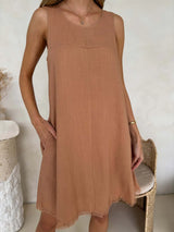 Discover our best-selling linen shift dress, perfect for casual occasions. The Freya Dress features a sleeveless design with a frayed hem just above the knee, crafted from breathable cotton blend for comfort and durability. Practical pockets and a comfortable lining ensure it flatters most body shapes. Ideal for warm weather, this shift dress is a must-have for your wardrobe.
