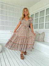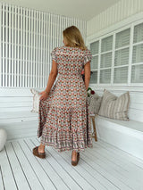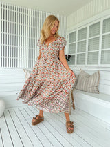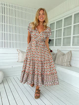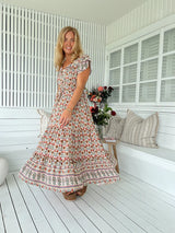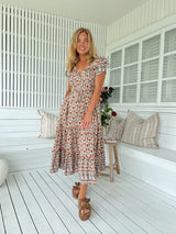 The perfect relaxed dress from Jaase - The Harlowe Print Slate Dress. With a drawstring at waist for comfort, button down bodice and embroidered features for effortless style.