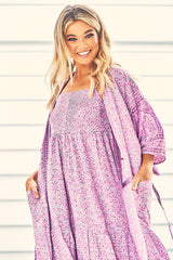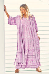 This light weight kimono features the gorgeous Jaase Lilac Skies print. Stunning floaty feels with roomy pockets and waist tie. This is the perfect item to dress up jeans and a tee or as you favourite house wrap.
