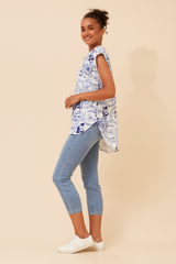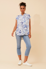 Cap sleeve postcard print shirt with curved hem
