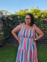 Print: A cheerful multicolor vertical stripe pattern in shades of pink, blue, yellow, orange, and white — giving it a bright, playful, and summery vibe.