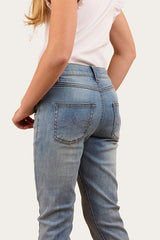 The Daphne Kids Bootleg Jeans are a stretch denim garment, created from a soft and breathable cotton blend. The mid rise design sits comfortably below the belly button whilst the bootleg tapers off below the knees, providing a comfortable and practical choice. Side splits at the hems are a functional and fashionable detail, allowing this mid-rise style to sit neatly over boots making them perfect for the avid horse rider or for the youngster who appreciates both style and practicality. Signature western inspired embroidery features on the back pockets, giving the Daphne's traditional western edge whilst woven labels and branded hardware complete the look with Ringers Western authenticity.