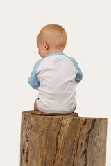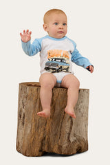 Made from 100% cotton with a super soft handfeel, this breathable, relaxed-fit romper is built for all-day comfort and easy movement. Long sleeves provide extra coverage for cooler days, while contrast neck binding and sleeves add a timeless western touch. A bold centre-front truck graphic brings classic country character, finished with a subtle signature circle logo at the back for unmistakable Ringers Western authenticity.
