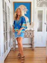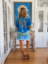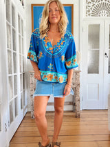 We are LOVING the new Riviera Print Gabriella Top from Jaase. Elevate your wardrobe with this beautifully printed flowy top. Featuring a flattering V-neckline and charming three-quarter lantern sleeves, this top adds a touch of elegance with its crochet scallop trim on the sleeve cuffs and hem. The oversized fit ensures a relaxed and stylish silhouette. Perfect for effortless sophistication!