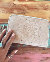 The Drifter Wallet from Mahiya can not be defined in terms of any other wallet. It is its own unique piece inspired by the gypsy lifestyle, wandering free. Lovingly handcrafted from the softest leather, the Drifter Wallet features our signature hand tooled mandala design, beautifully accentuated with metal studs. The zip closure conceals a selection of pockets and compartments, all lined with beautiful fabric. Make this wallet part of your everyday wardrobe, or team it with one of our gorgeous leather bags and your gypsy wears to complete a perfectly bohemian look.