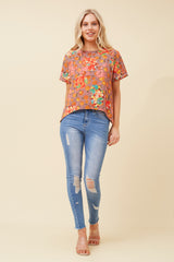 Add a pop of colour to your everyday wardrobe with this vibrant, eye-catching tee. Featuring a bold floral and abstract print in warm sunset tones of pink, red, orange, and hints of green, this piece is perfect for standing out while staying effortlessly comfortable.