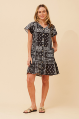Short sleeve Bandana crinkle print button through peplumn dress