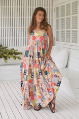 Turn heads in this gorgeous maxi dress, featuring a delicate strap and a straight bust line paired with a flowing, multi-layered skirt. This eye-catching Jaase maxi showcases a vibrant Jaase print..
