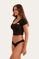 A harmonious blend of comfort and style for the modern cowgirl. Made from a cotton/elastane blend this set offers both softness and a hint of stretch, ensuring a cozy and snug fit as you drift away into a deep sleep. The cropped top radiates a laid-back style while the cheeky bottoms add a touch of playful sass. The minimalist design is complemented by a self-fabric bind and offers a secure fit without being too restrictive. Whether you're lounging around at home or spending a night under the stars, our sleepwear set captures the spirit of your inner cowgirl and will have you slumbering in style.