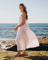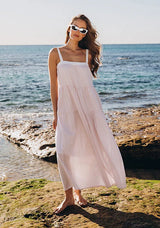 The Amia Maxi Dress Vanilla offers effortless summer style with its breathable beige and white check pattern complemented by crisp white trim. Designed for comfort, it features a pull-on fit with a simple tie at the neckline, eliminating the need for zips or buttons. The tiered skirt flows gently from the bustline, providing a breezy silhouette perfect for warm days. This dress combines ease and elegance for relaxed yet refined summer dressing.