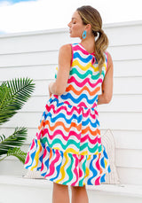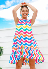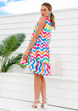 The Rio Dress will see you from lunch date to evening party!! A fresh 60's inspired shift dress cut, with a cool vibrant rainbow wave print with the scoop neckline a complimentary pink trim to match the arm openings. The frilled hemline adds a little extra to her style, while its 100% cotton fabrication ensures comfort and breathability day and night. This dress will be a "chuck on and go" type of dress, that you know will always have you looking your best!