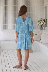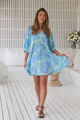 This sweet mid sleeve shift dress in a boldly patterned design with a button v-neckline is the perfect Summer mini.