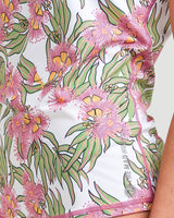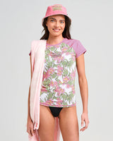 The Pink Galah Anchor Women's Raglan Short Sleeve Rashie in Pink features an all-over custom galah/leaf print, adding a playful and vibrant touch to your swimwear collection. With contrast sleeves and a neck bind for extra style, this rashie is designed to be form-fitting for a comfortable, flattering look. Perfect for sun protection and water activities, it combines functionality with a unique design, making it an essential piece for your active lifestyle.