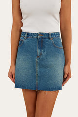 The Venice skirt is the perfect Summer essential - made from 100% premium cotton this skirt will have you feeling and looking your best for all the seasons to come. This is a rigid denim style, meaning this skirt will feel more structured than a stretch denim but still offers maximum comfort and breathability. The Venice is a high-waisted style with the waistband sitting naturally just above the belly button, snug around the hip and seat before slightly flaring out into a classic A-frame shape. It features a zip fly opening for easy wearing and five belt loops which will fit a standard width belt for extra support.