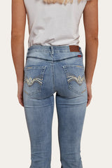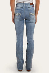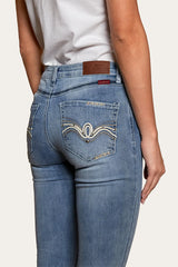 Caroline is a mid-rise bootleg style - a timeless wardrobe staple that can adapt to a number of occasions whether it's casual, professional or somewhere in between. Our Ringers Western mid-rise jeans sit comfortably between the high-waist and low-rise point, designed to rest around the mid-section of the waist and just below the belly button. These bootleg jeans are fitted around the waist and hips, highlighting the wearer's natural curves without being too tight. Hugging the thighs and making its way down to the knee where the bootleg shape begins to slightly flare out, creating our signature bootleg shape. Made from a cotton stretch blend, these jeans provide durability and breathability balanced out with the right amount of stretch to get you up and sitting pretty in the saddle. Caroline features lurex embroidery and rivet detailing on the back pocket which will have you standing out wherever you go.