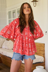Fall in love with this ultimate boho fantasy our gorgeous Zamora Print Temple Blouse From Jaase, featuring relaxed balloon sleeves and loose fit.